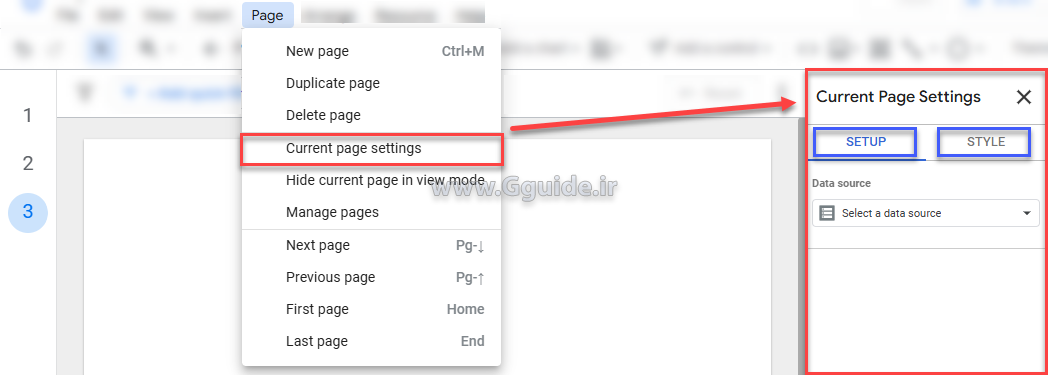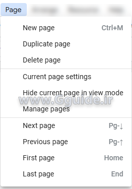 گزینههای منوی Page در لوکر استودیو (Looker Studio):